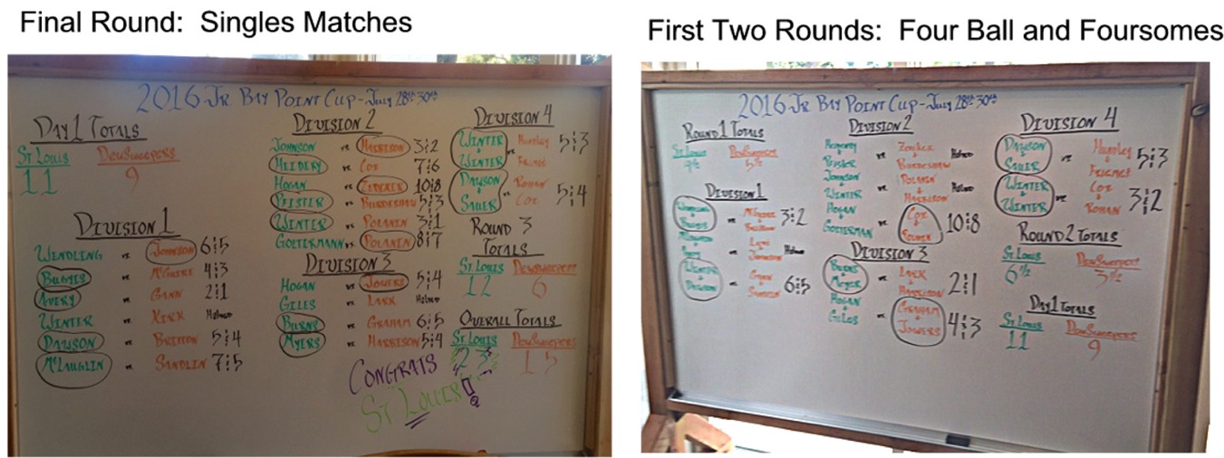 SLICJGA Wins 2016 Bay Point Cup!The first annual Bay Point Cup (Junior Invitational) kicked off with a practice round on Thursday July 28, followed by a fantastic island beach party at Pelicans on property. Players, parents and family members as well as the two team captains, Jim McLaughlin (SLICJGA) and Amy Willmon (Dew Sweeper Academy), and the golf staff at Bay Point joined the fun! The first round of this junior Ryder cup event began on Friday, July 29 with a "Four Ball" match, where the Dew Sweepers took the lead with a score of 5 1/2 to 4 1/2. The second round of the day was a "Foursomes" match, where SLICJGA team led 6 1/2 to 3 1/2, and took over the Day 1 lead with a total score of 11 to 9. The final match on Saturday, July 30th, proved to be the strongest day for the SLICJGA team, finishing the Singles event with a 12 to 6 score and an overall match win of 23 to 15! Final match "Singles" wins included: Avery 2&1, T.Dawson 5&4, McLaughlin 7&5, Bugyis 4&3, Heidenry 7&6, Pfister 5&3, G. Winter 3&1, Burns 6&5, Myers 5&4, A./E. Winter 5&3, J. Dawson/ Sauer 5&4. Halved matches included: R. Winter, Giles. |